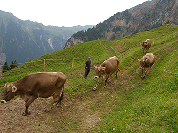 Ende Juli zügeln wir die Kühe auf Glattegg 1850m.ü.M., wo sie Tag und Nacht draussen sind. Die Älpler sind morgens sehr früh mit dem «Schilter» unterwegs, um die Kühe zu melken, die Tiere auf die Weide zu treiben und die Milch hinunter zur Biwaldalp zu transportieren, wo sie dann verarbeitet wird.